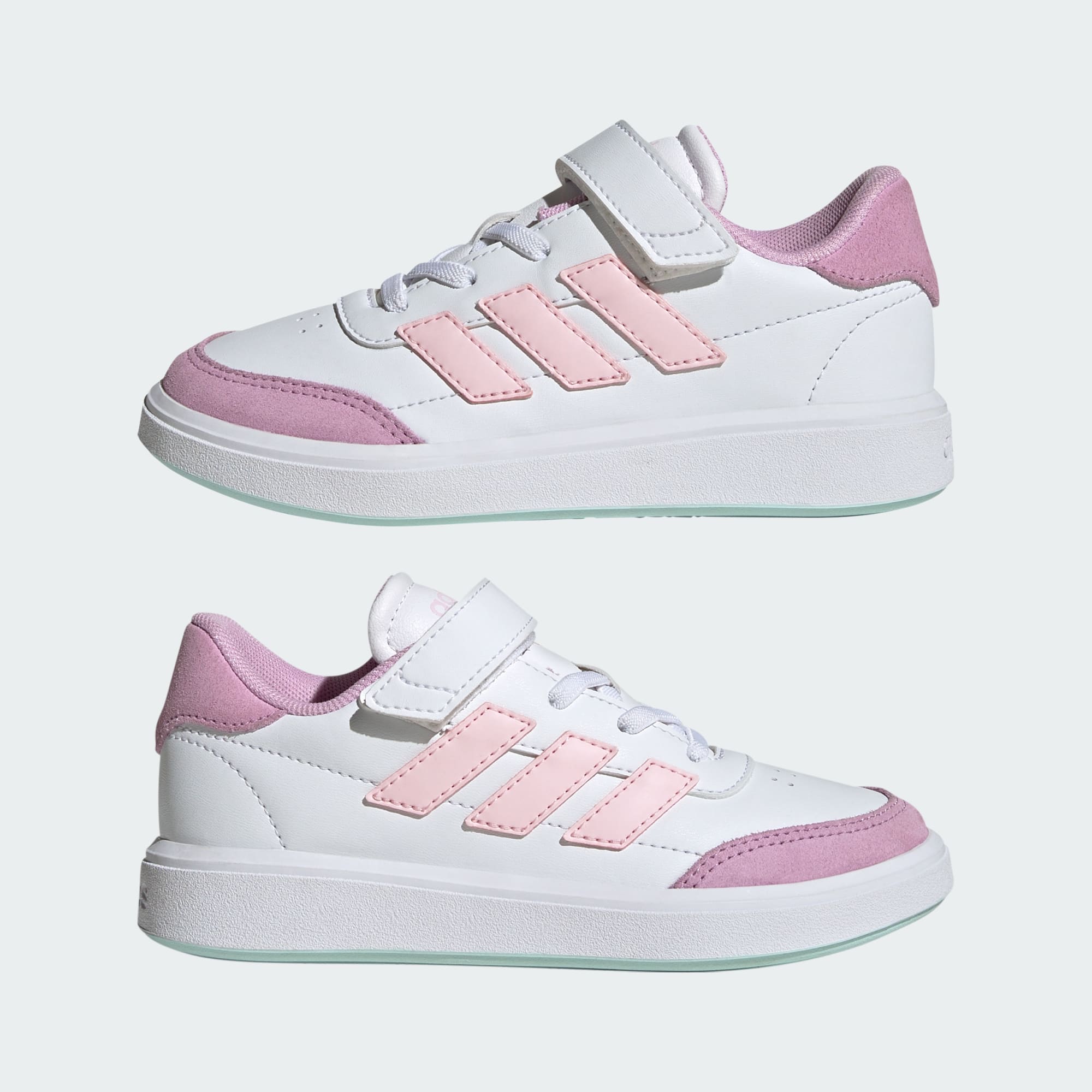 Sleek and sporty kicks for kids who are on the move all day. Made from smooth faux leather upper, these kids' adidas sneakers stand up to regular wear. A soft lining keeps the foot comfortable while a sturdy rubber cupsole provides grip for running, climbing and games of tag. A classic lace-up front, topped off with a hook-and-loop strap, provides a secure fit through all kinds of escapades.